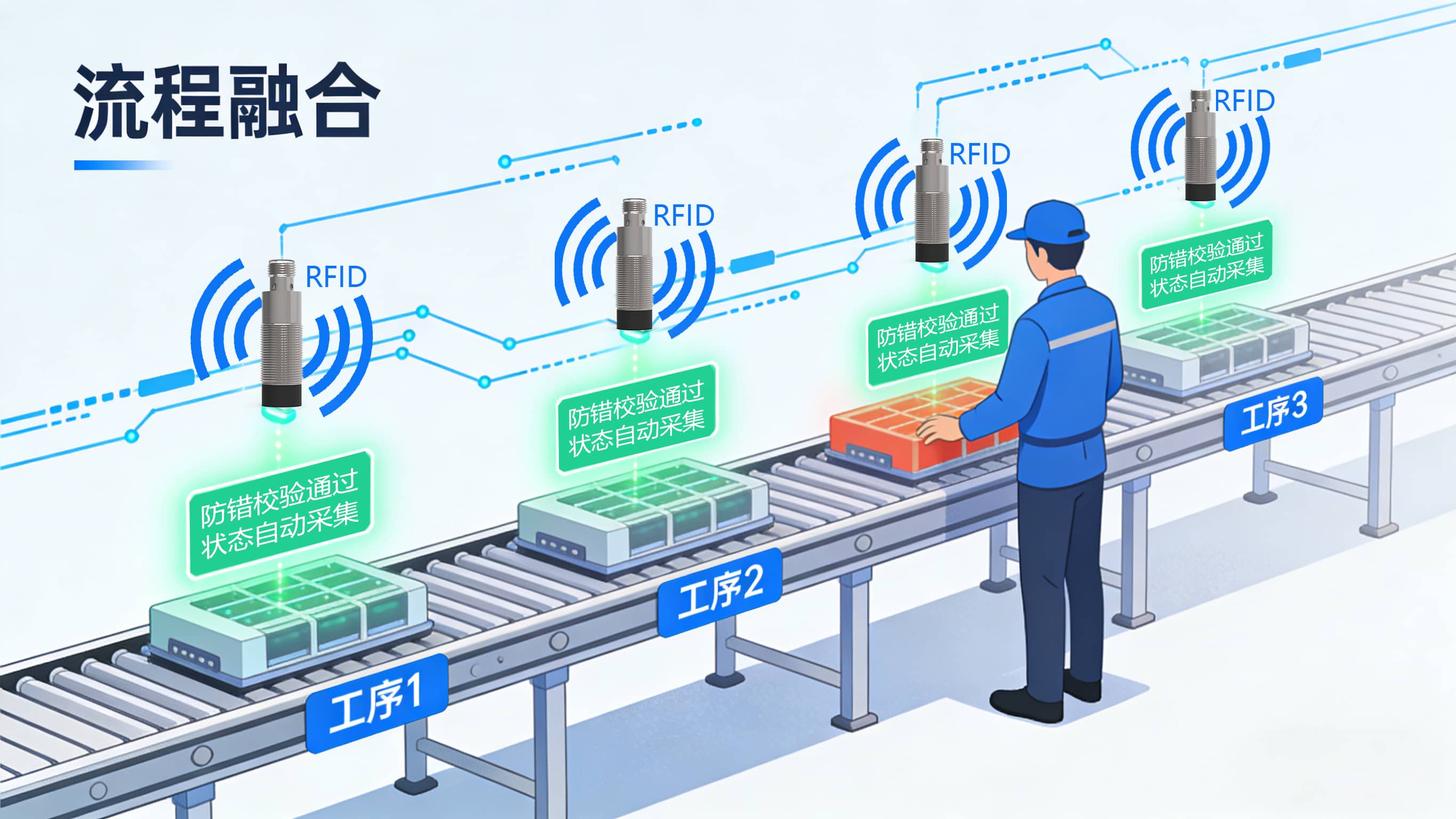 用于3C行业自动化线体。在每个工位安装RFID读写器,在工装上安装...